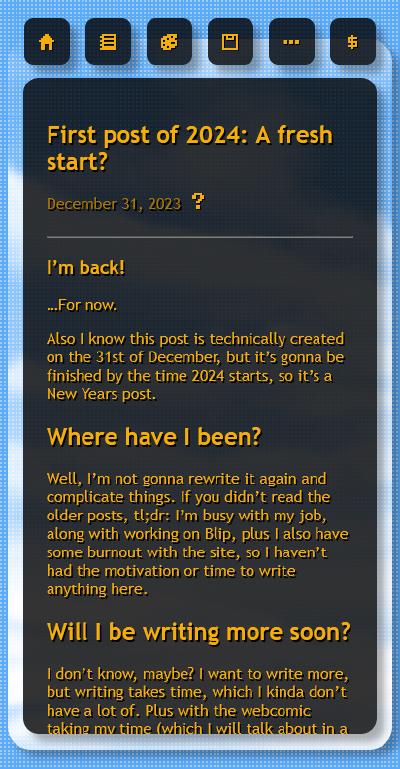 Firstly, and most importantly, I made a mobile layout for my site. Before, the site was built for a strict 1024x768 screen in mind. However, this was not very practical since most people who would want to use the site at that resolution are assumedly using old computers with browsers that aren't even compatible with all the fancy bells and whistles modern CSS and HTML introduce. So now, I've recreated the layout to be a little more... not strict? I don't know.